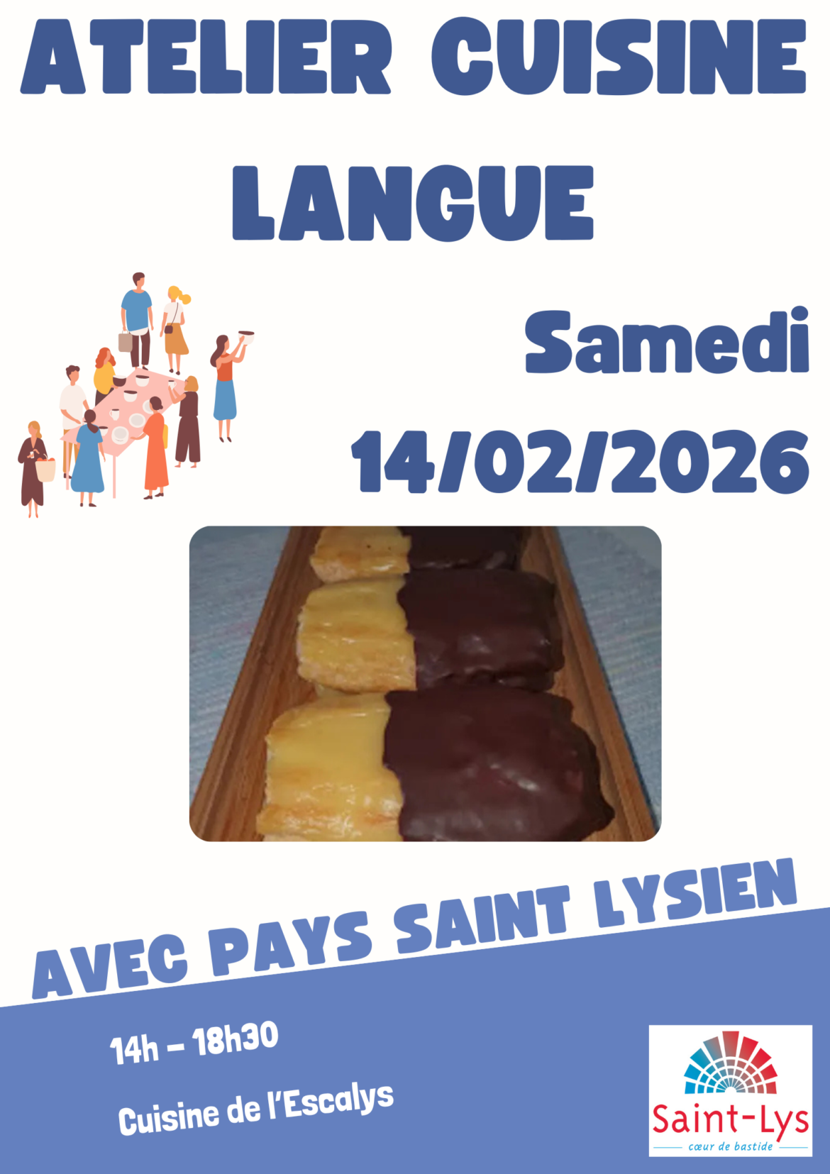 C’est en petit groupe (10 max.) que Pays Saint Lysien vous propose de réaliser un plat Portugais à la cuisine pédagogique de L’Escalys le 14 février. C’est sous la direction de Lénia que vous pourrez découvrir cette recette en Portugais (Pas d’inquiétude on la traduit ensemble…). Le coût des composants est partagé entre tous. Le plat réalisé est aussi partagé entre tous. Pour participer vous devez vous inscrire sur pslpepm@gmail.com. Une confirmation vous sera envoyée (Seuls les dix premiers inscrits peuvent participer ; la date et l’heure du mail permet d’éviter toute contestation). Il y aura un atelier par mois alors surveillez la prochaine parution !!!